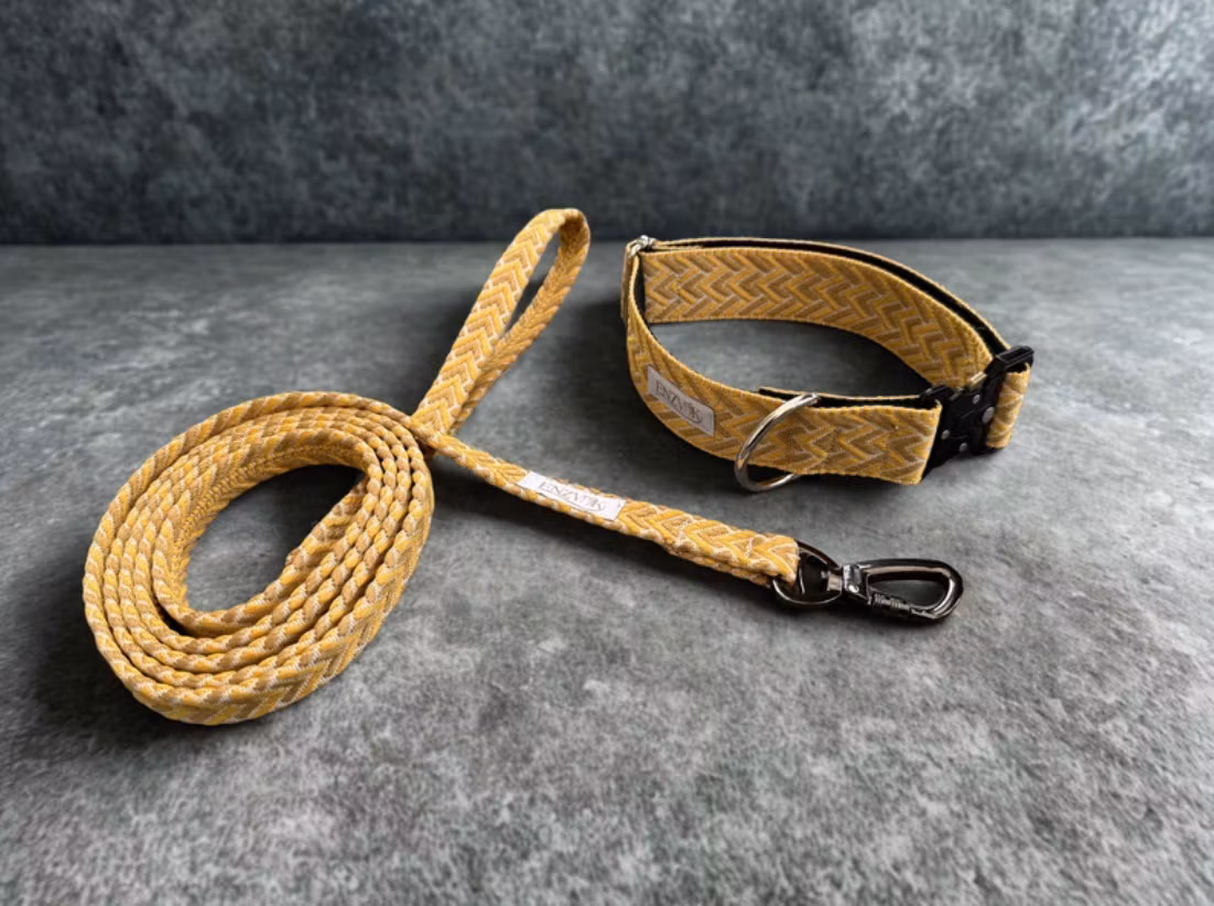 Ett stilrent och slitstarkt koppel designat med inspiration från nordisk natur och tidlös estetik. Det vävda mönstret i dämpade gröna och naturfärgade toner ger ett harmoniskt uttryck samtidigt som materialet erbjuder hög komfort och hållbarhet för dagliga promenader.