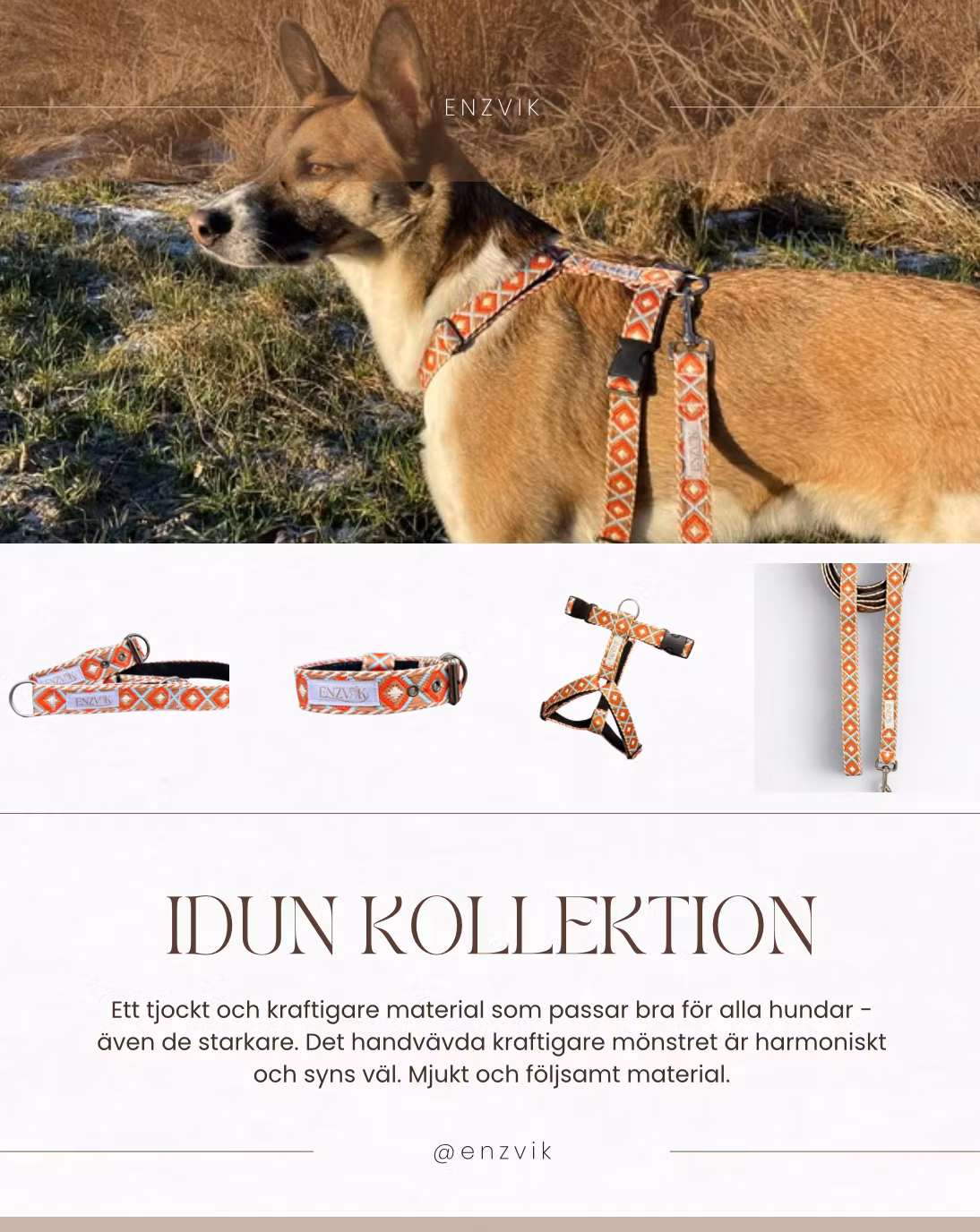 Matchande set med hundhalsband och koppel – en genomtänkt helhet för dig som vill ha både funktion och ett enhetligt, nordiskt uttryck. De vackert mönstrade banden är inspirerade av traditionella skandinaviska textilier och kombinerar klassisk design med modern kvalitet.