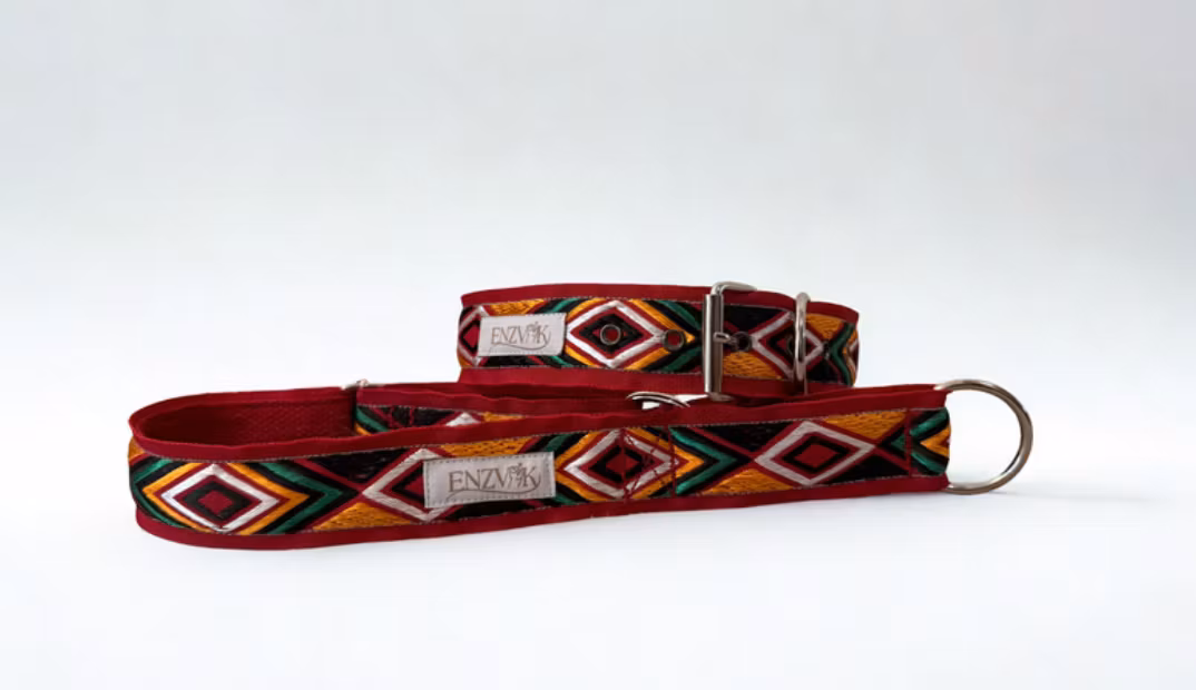 Ett färgsprakande halsband sytt med starka band. Personligt och uttrycksfullt med vackra mönster och färger.