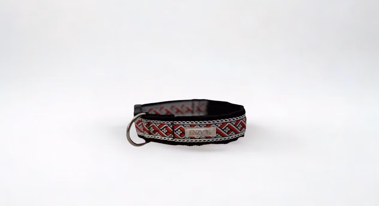 Vävt elegant mönster i silver, mörkröd och svart, förstärkt med band mellan det vävda mönstret och insidan av halsbandet. Ett halsband som håller för starkare drag!
